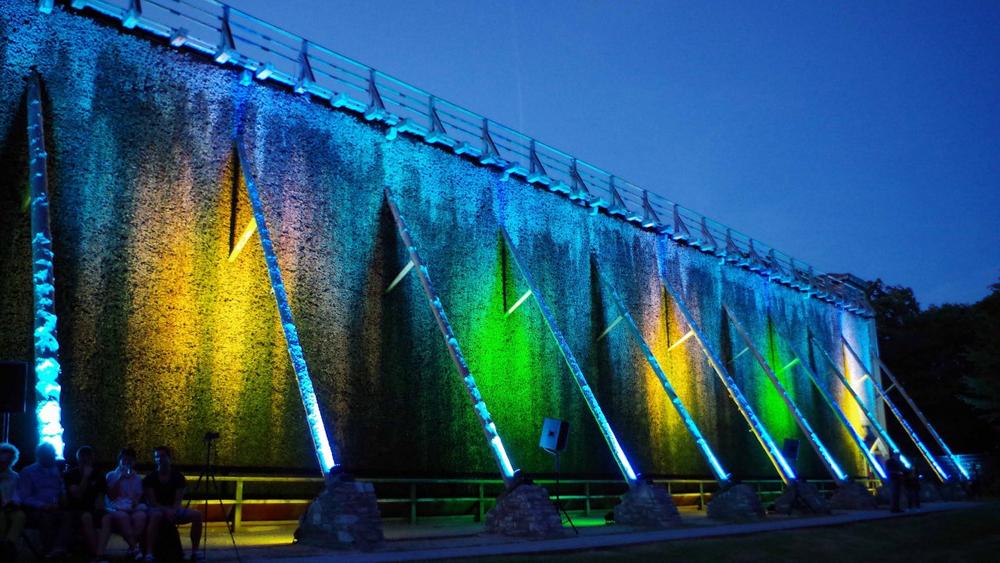 Der Gradierbau I wird in den Abendstunden stimmungsvoll illuminiert. Packen Sie Familie, Freunde und ein Picknick ein und machen Sie es sich auf der angrenzenden Liegewiese gemütlich.