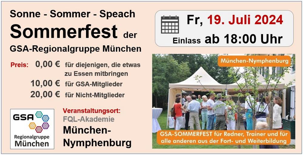 Das Sommerfest findet in einem Garten in München (Nymphenburg/Gern) statt. Es werden sowohl Stehtische als auch Bierbänke/Tische zur Verfügung stehen. Im Vordergrund des Sommerfest steht der ungezwungene Austausch untereinander. Jeder Gast kann/darf nicht nur seine/n Partner/in sondern auch etwas zu essen mitbringen (Salat, Salziges oder Süßes) … und kann dann kostenfrei beim Sommerfest dabei sein. Wer nichts mitbringt, zahlt